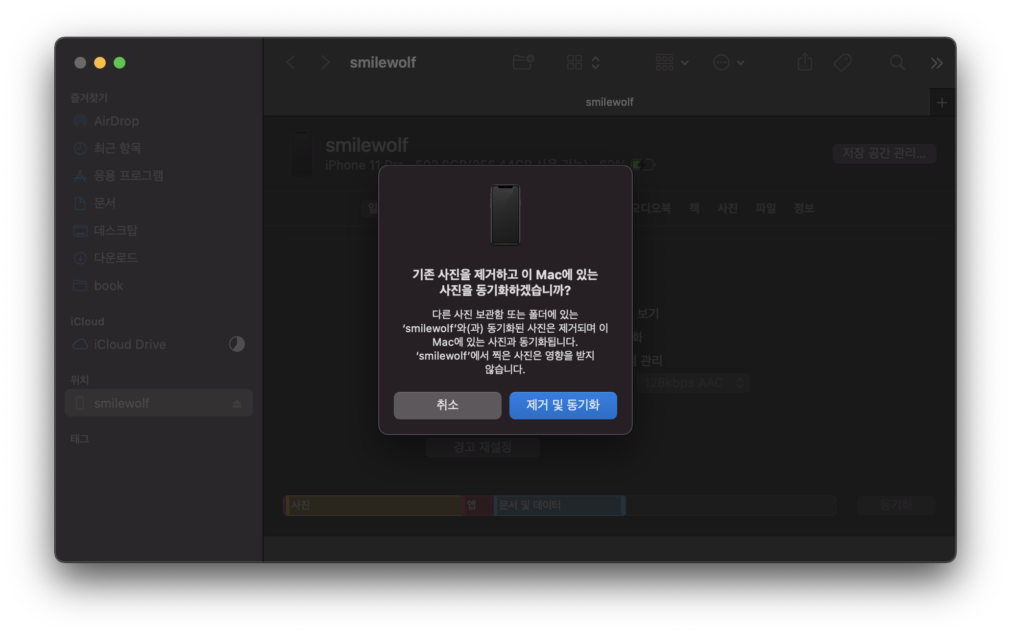 '기존 사진을 제거하고 이 Mac에 있는 사진을 동기화하겠습니까?'
