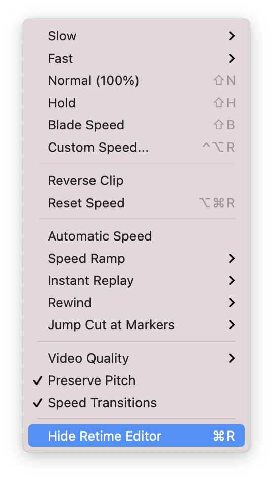 [modify]-[retime]-[hide retime editor]를 클릭하면 영상클립의 속도, 재생방향등이 표시되는걸 안보이게 할수 있다.