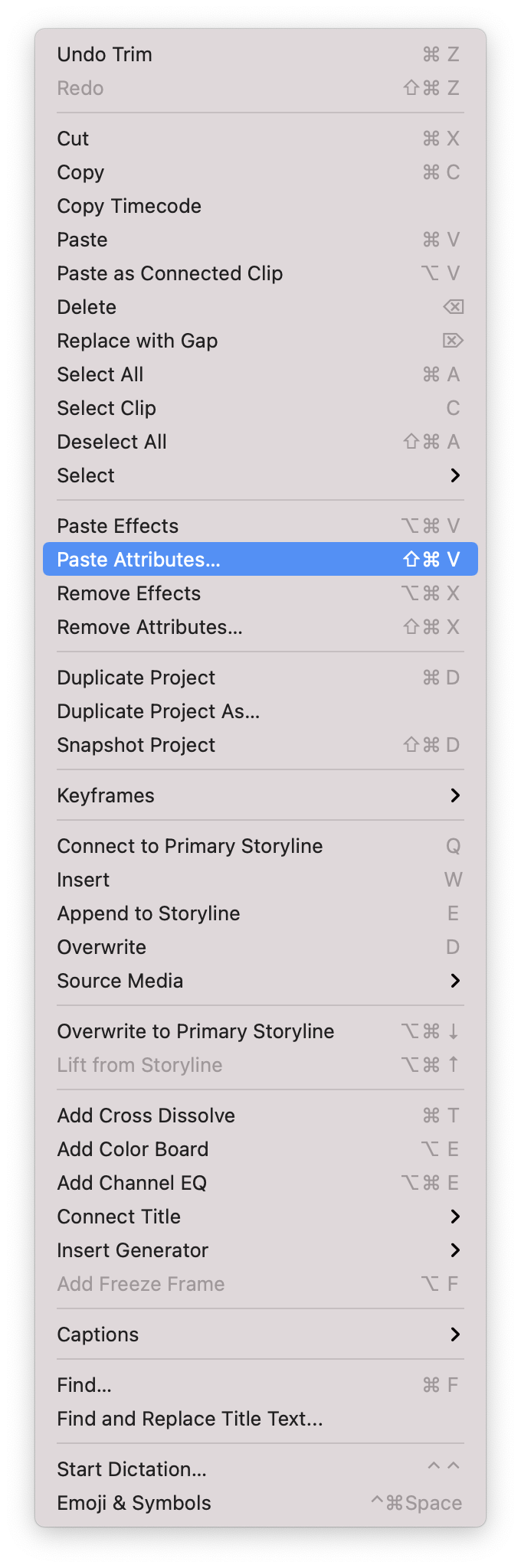 [edit]-[paste attributes]를 하면 클립에 적용한 효과를 그대로 다른 클립에 적용할 수 있다.