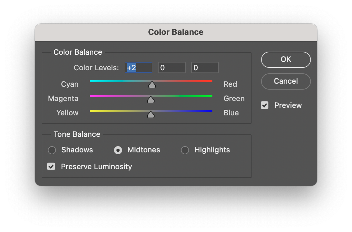 보색으로 표시된 컬러값을 이미지의 어두운 톤, 중간 톤, 밝은 톤으로 분리해 조정할 수 있다.