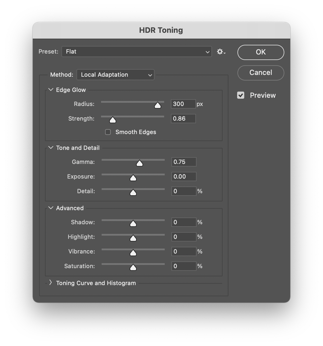 HDR Toning 필터에서 surrealistic low contrast