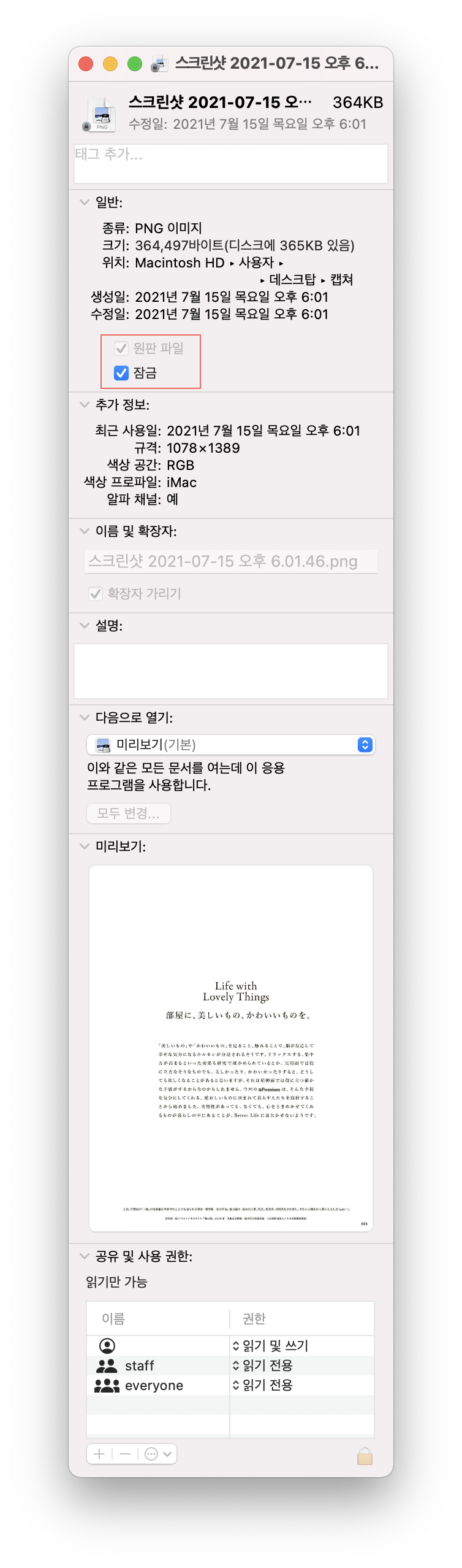 '원판 파일', '잠금'을 체크하면 파일을 보호할 수 있다.