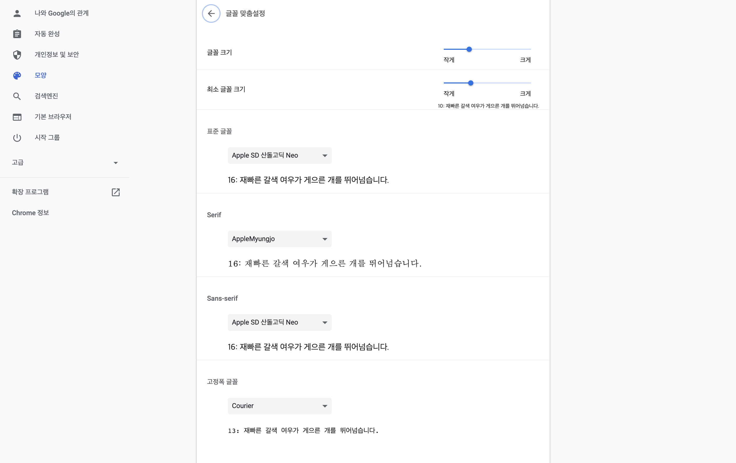 나는 아이맥을 사용중이라 기본 한글서체로 지정된 산돌고딕Neo가 브라우저에서도 기본 서체로 적용되어있었다.