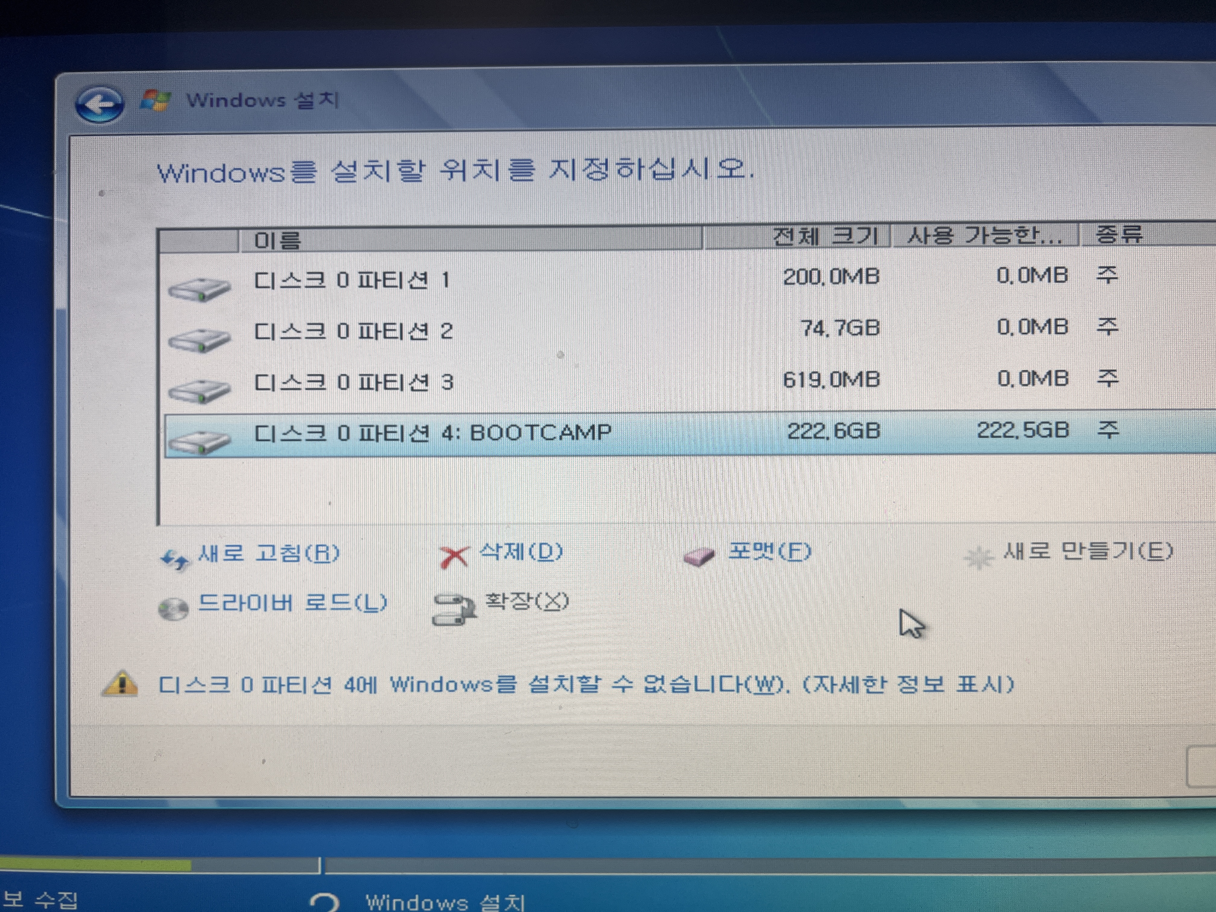 파티션4에 윈도우7을 설치할 수 없다고 해서 당황!