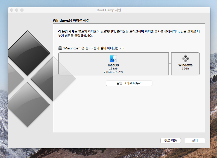 윈도우와 맥을 어떻게 파티션을 나눌것인지 용량을 정해주고 '설치'를 클릭해준다.