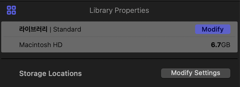 우측에 있는 인스펙터 패널을 보면 라이브러리 사이즈를 체크할 수 있다.