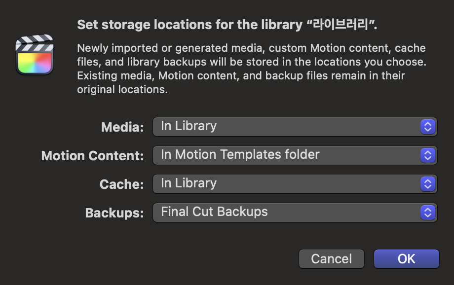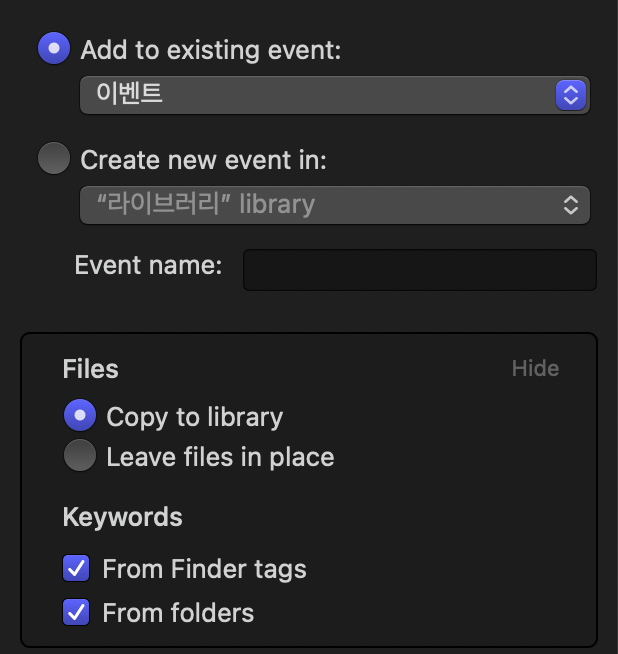 파이널 컷을 실행하고 cmd+I 로 import를 실행하면