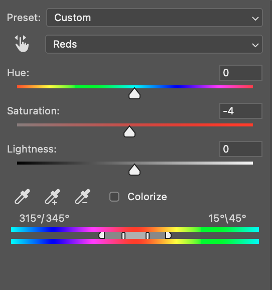 Hue / Saturation (cmd+U): 색조, 채도, 명도를 조정한다.