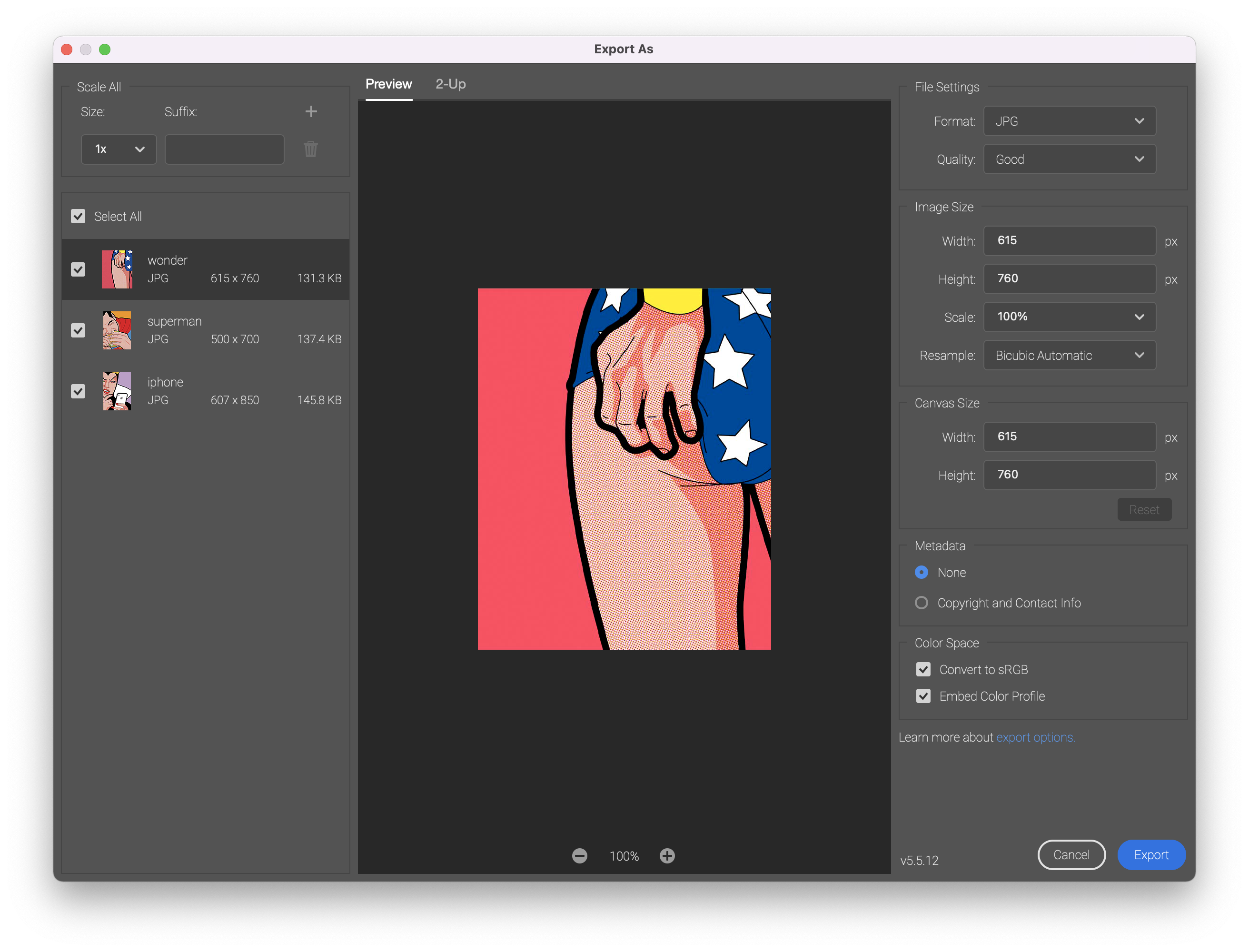 quick export as JPG 보다 더 디테일하게 옵션을 변경해서 내보내기 할 수 있는 장점이 있다.