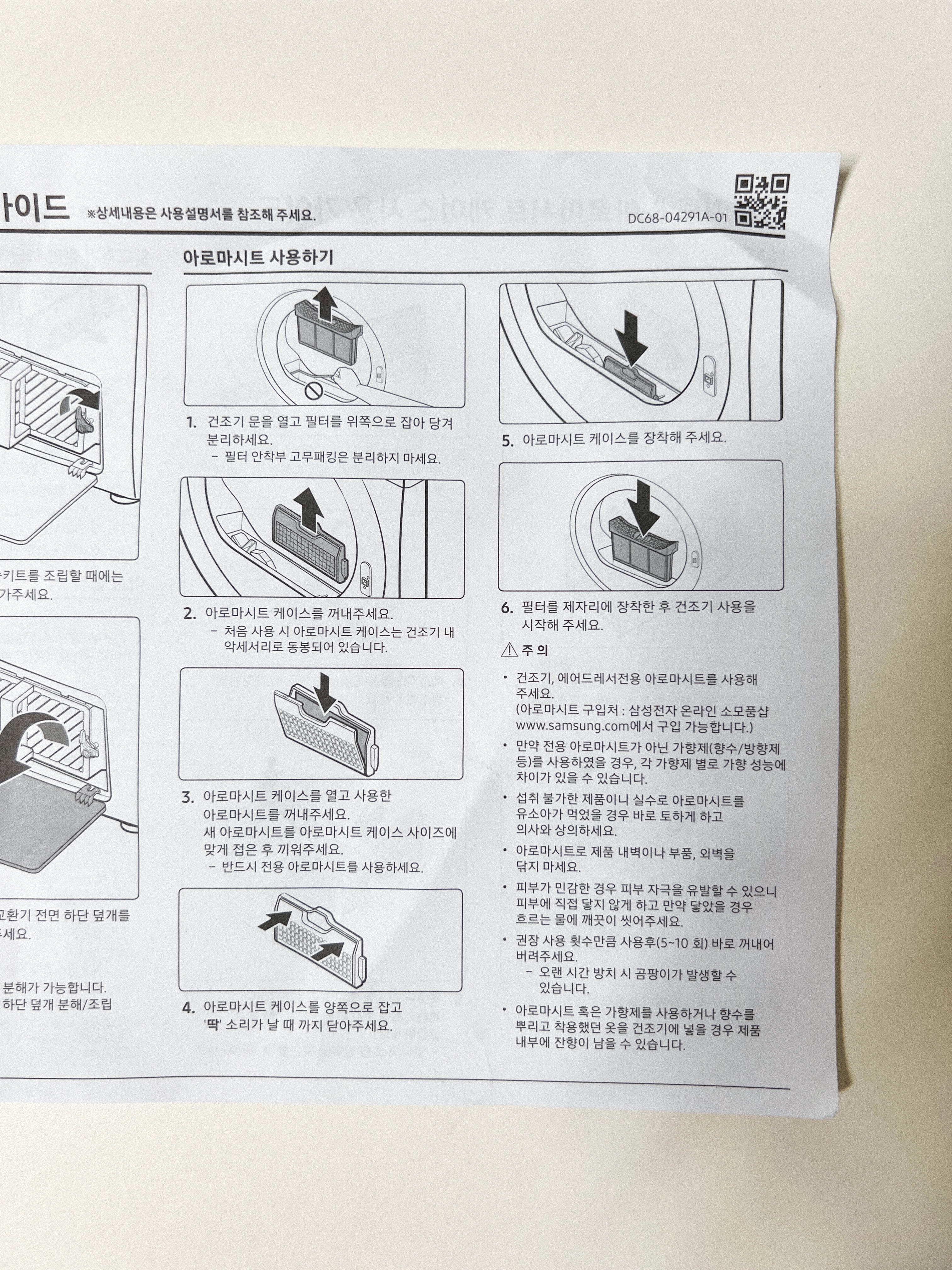 삼성 건조기 DV19T8745BW 설명서에는 제습기 사용방법과 삼성 아로마 시트 사용방법이 적혀있다.