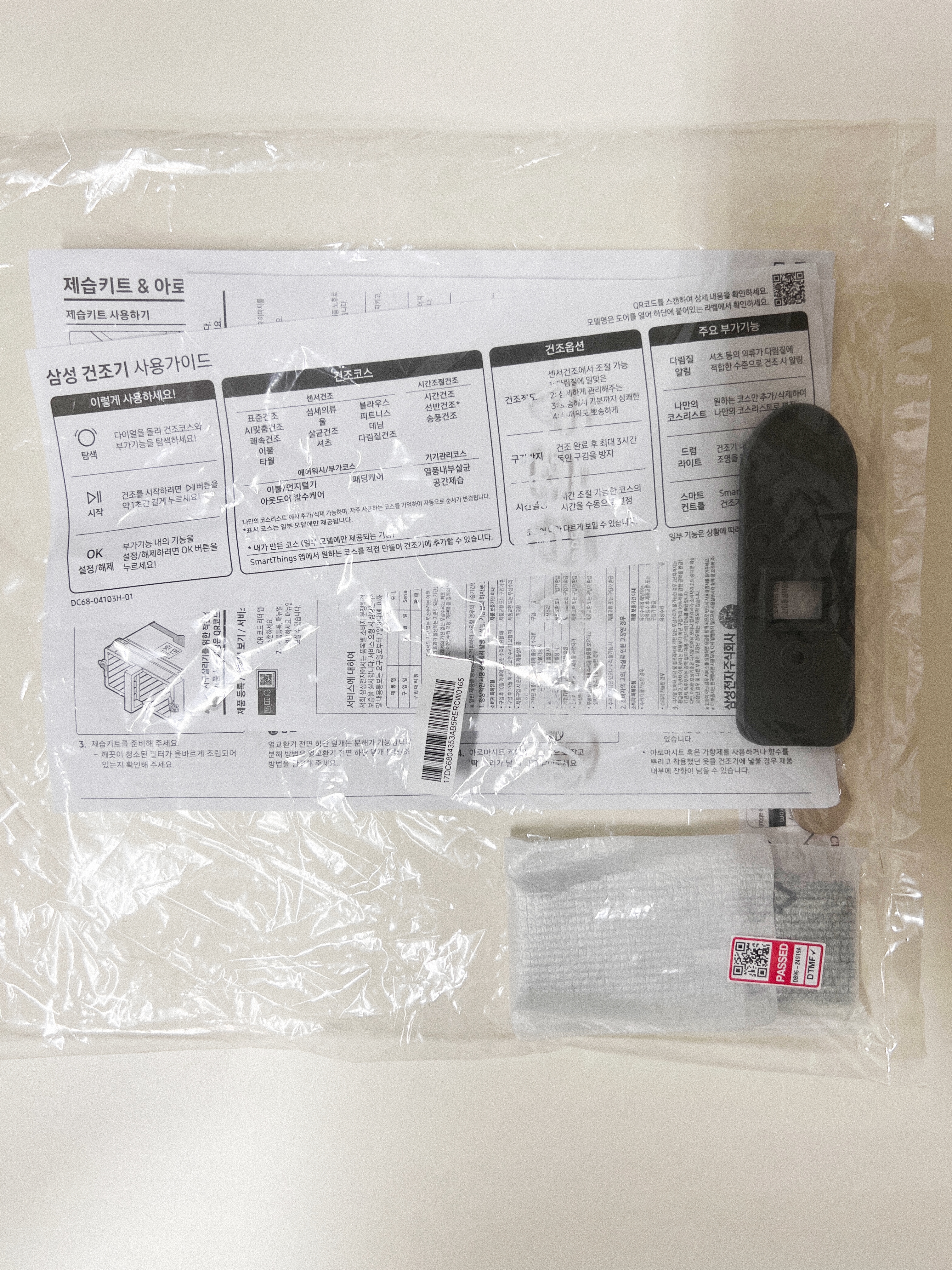 삼성 건조기 DV19T8745BW 모델을 구매하면 위와 같은 구성품을 제공해준다.