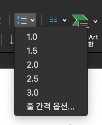 파워포인트에서 줄간격(행간)을 조절하려면 위와 같은 아이콘을 클릭하면 숫자가 나오는데