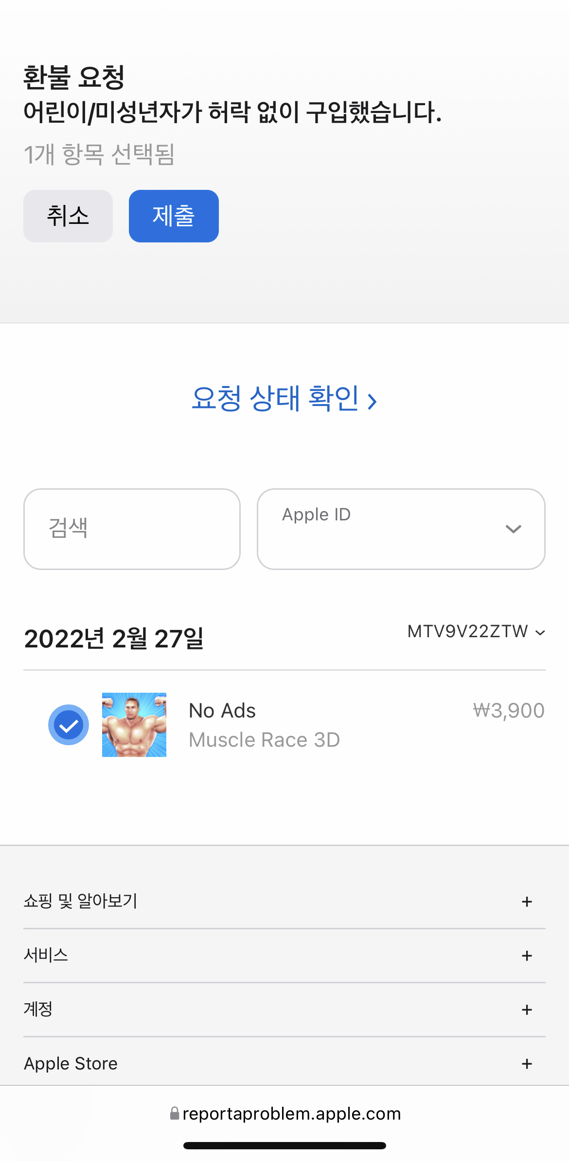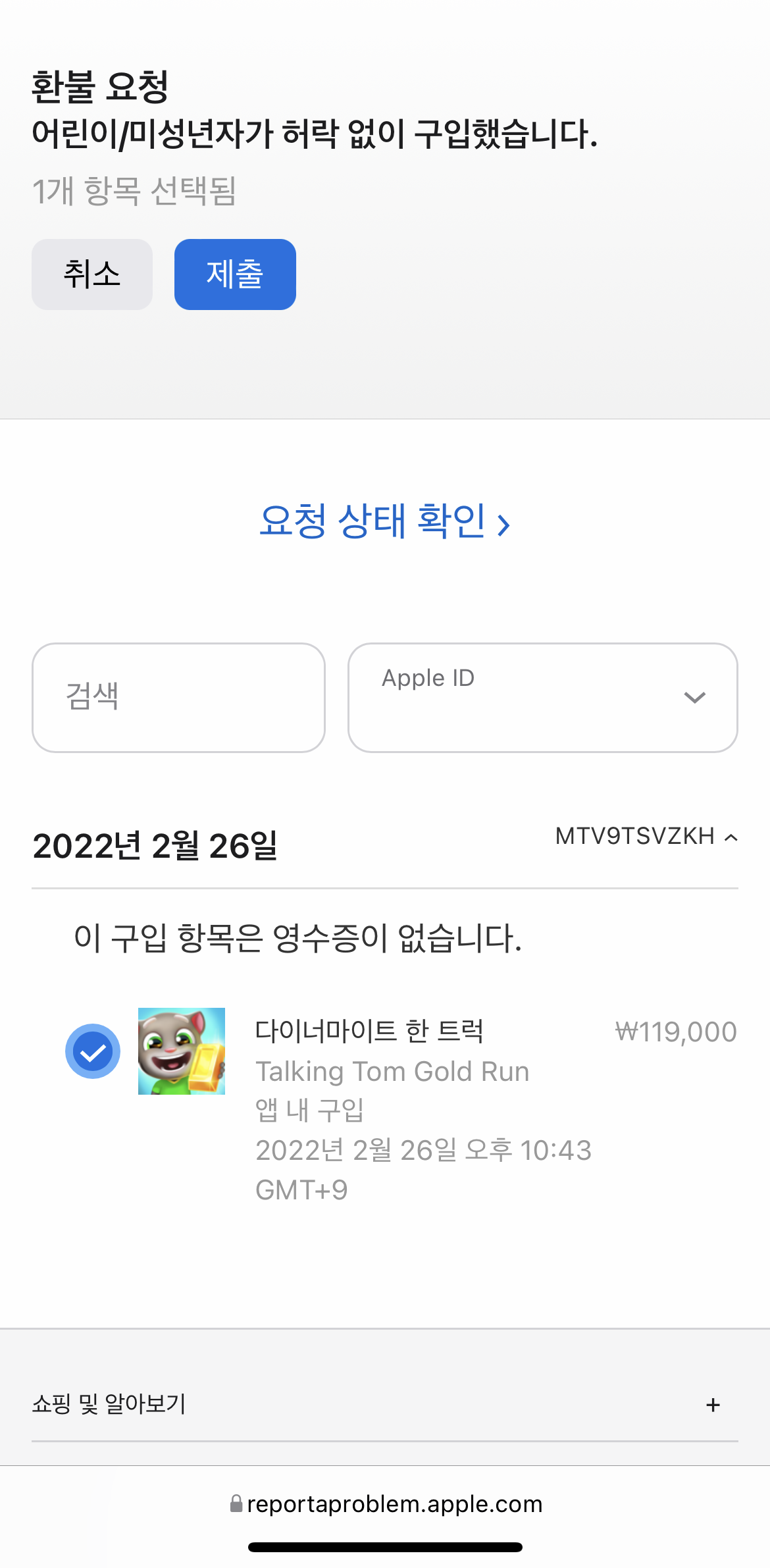'어린이/미성년자가 허락없이 구매했습니다.'로 선택하고 제출했다.