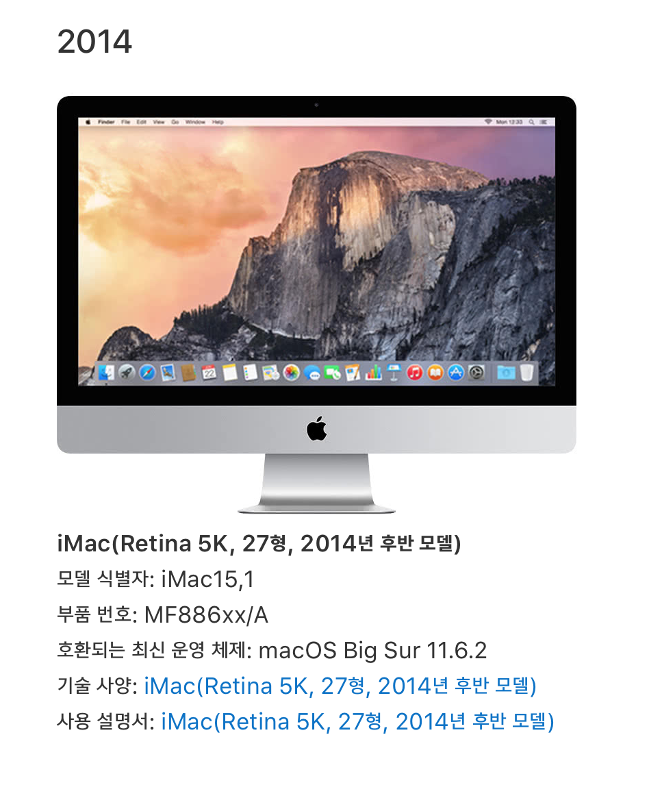 귀하가 사용중인 아이맥 2014 late모델은 Big Sur이후 더이상의 OS업그레이드는 지원하지 않습니다.Monterey 이상의 맥OS를 사용하려면 다음과 같은 맥모델이 필요합니다.