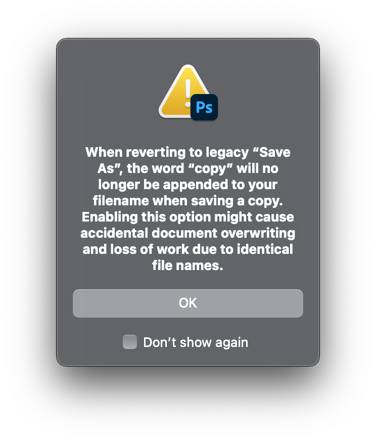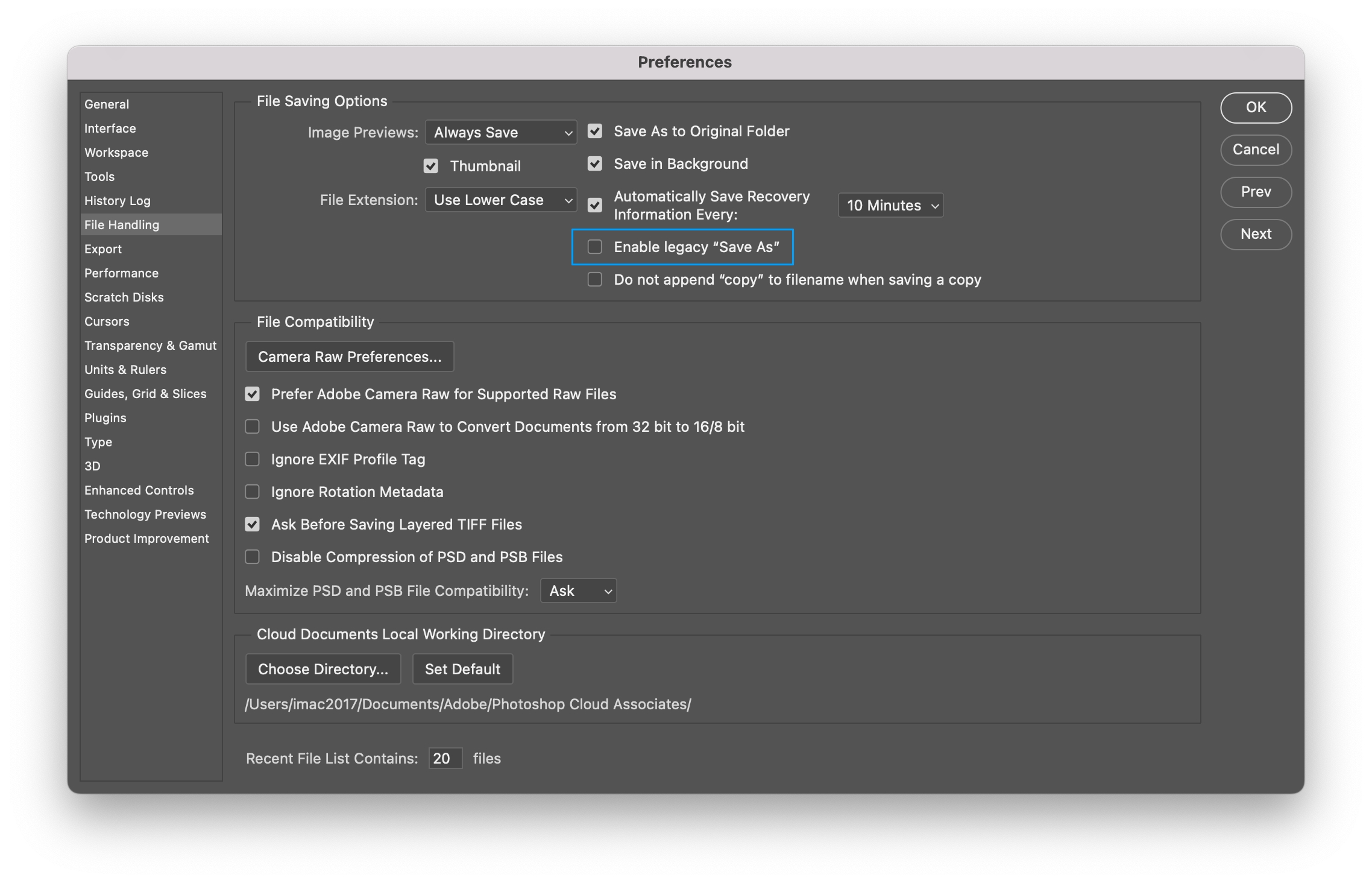 어쨌든 이걸 체크하면 이제 예전처럼 포토샵 save as 기능을 자유롭게 쓸 수 있게 된다.