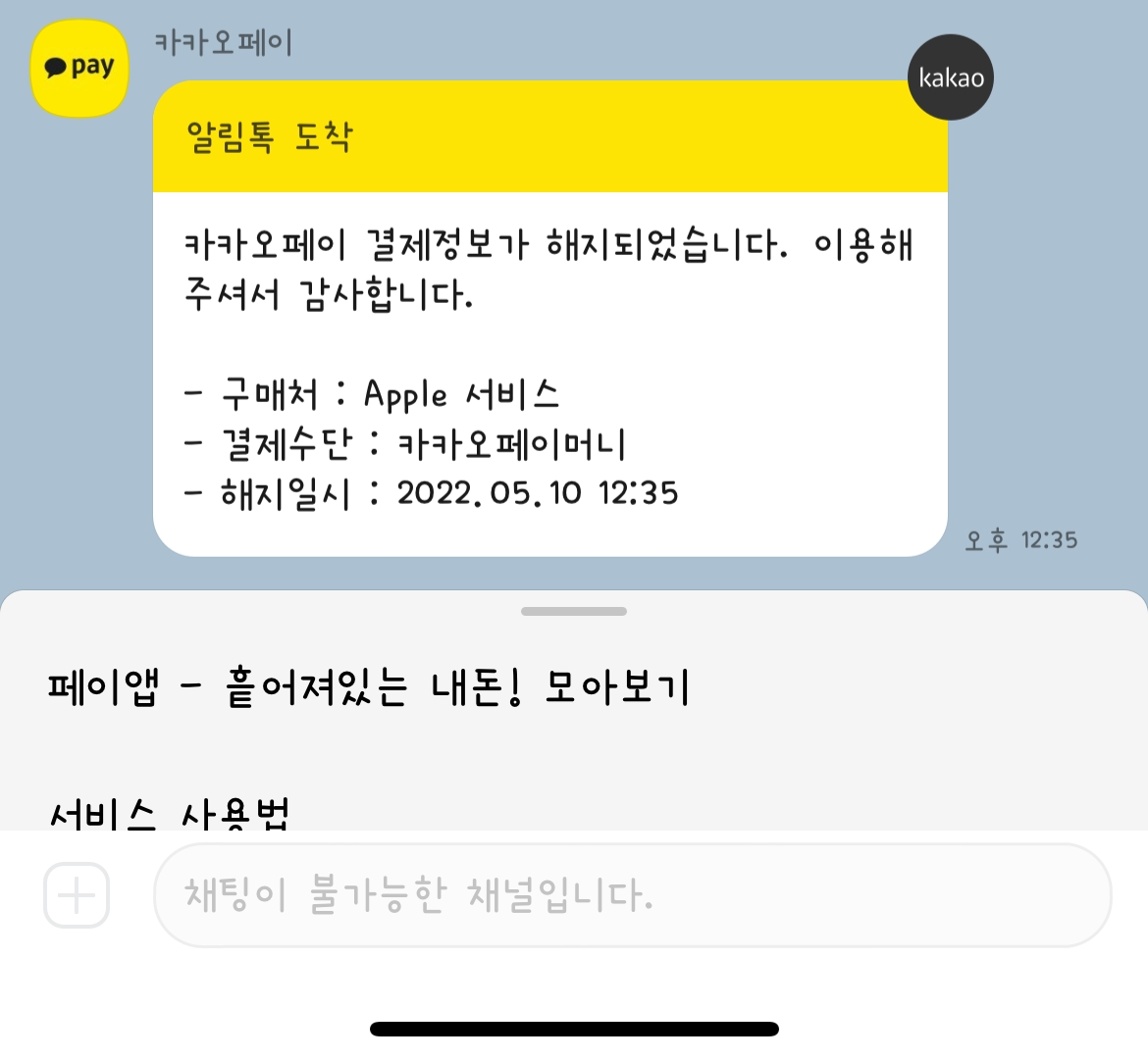 카카오톡으로 카카오페이 결제정보가 해지됐다는 알람이 떴다!