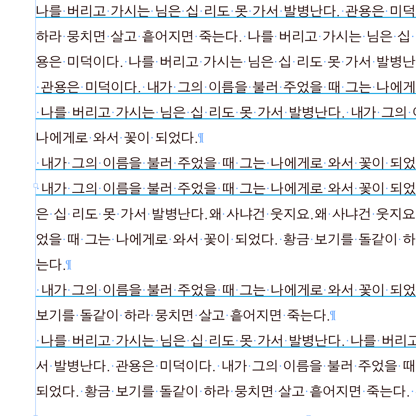 띄어쓰기는 파란 점, 줄바꿈은 기호(?)로 표시가 되는데