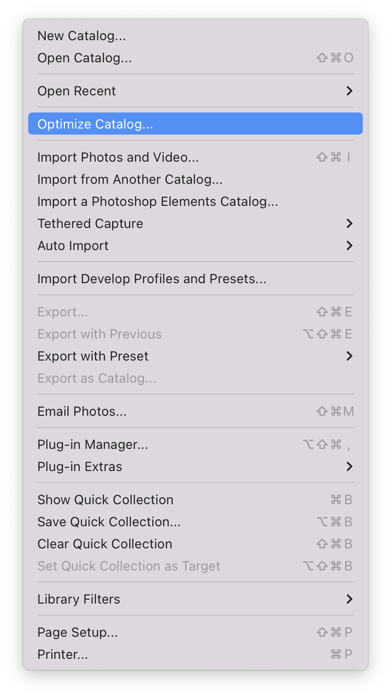 모든 과정이 카탈로그 안에서 이루어지기 때문에 라이트룸이 느려질때는 카테고리 최적화를 시켜주면 되는데