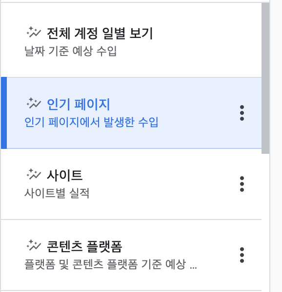 애드센스홈에 들어가서 좌측 메뉴를 보면 '인기 페이지'라는 항목이 있는데