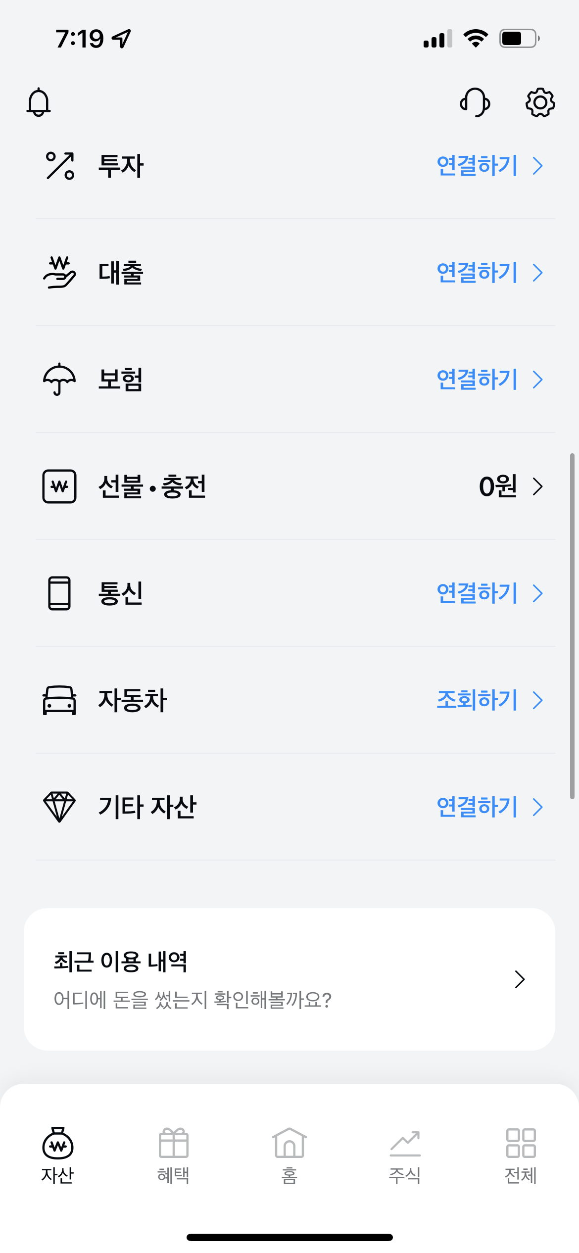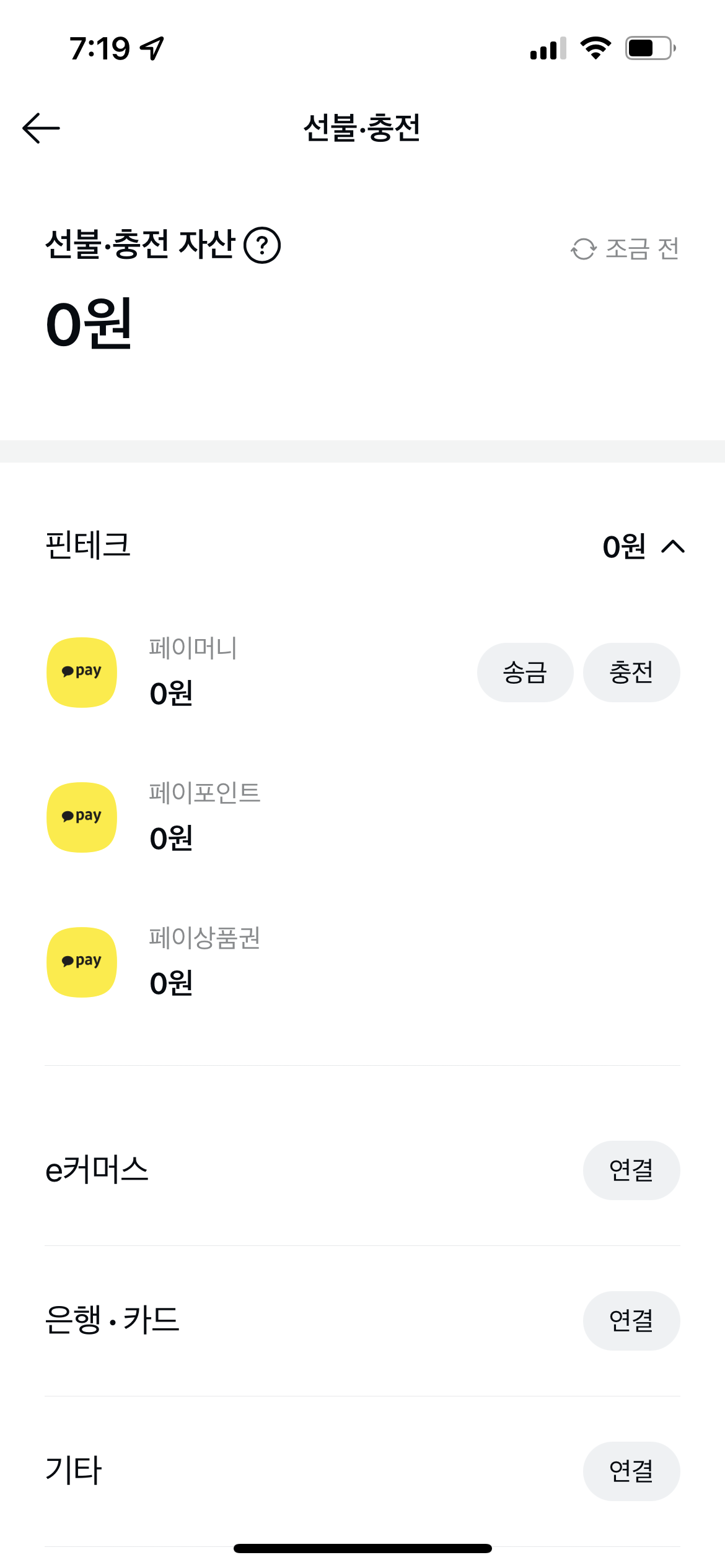 '자산'을 선택한 후 메뉴를 아래로 조금 내려보면 '선불, 충전' 메뉴가 보인다.