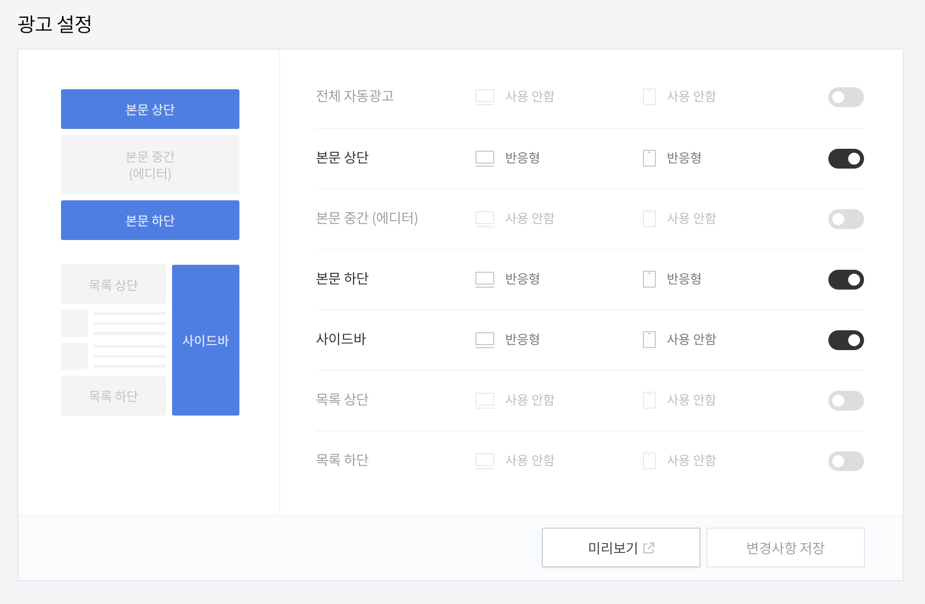 본문글 중간에 어떤 광고를 넣을껀지 선택할 수 있다.