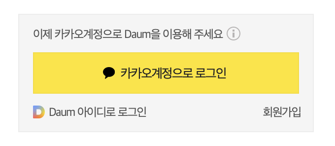| (주)카카오의 다양한 서비스를 하나의 카카오계정으로 이용할 수 있도록 회원 정책이 변경됨에 따라, Daum 로그인 방식도 카카오계정으로 일원화될 예정입니다. |