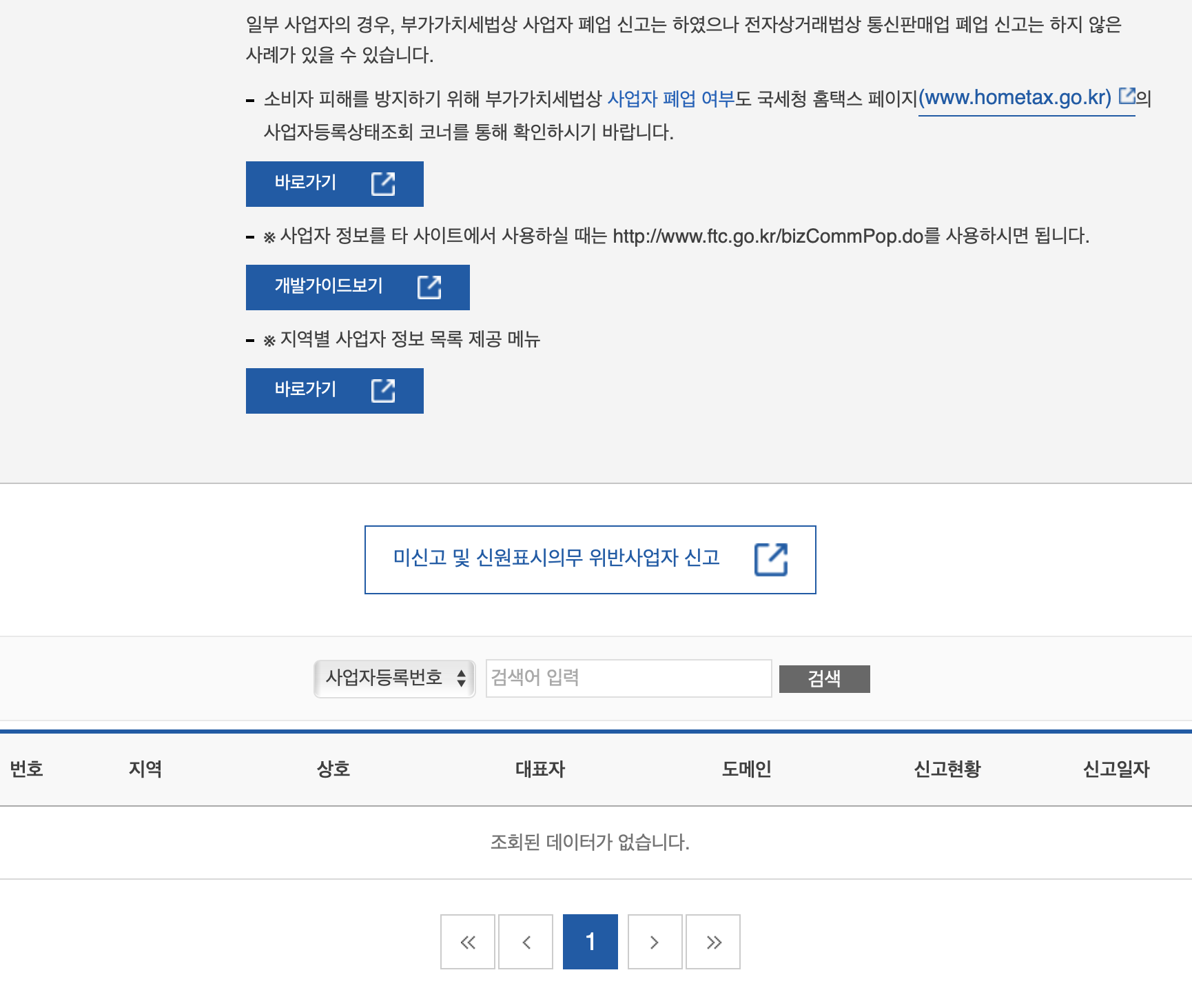 잘못된 UI로 인해 저 3개의 파란색 아이콘만 눈에 띄니까 통신판매업 번호조회는 찾을 수가 없다!