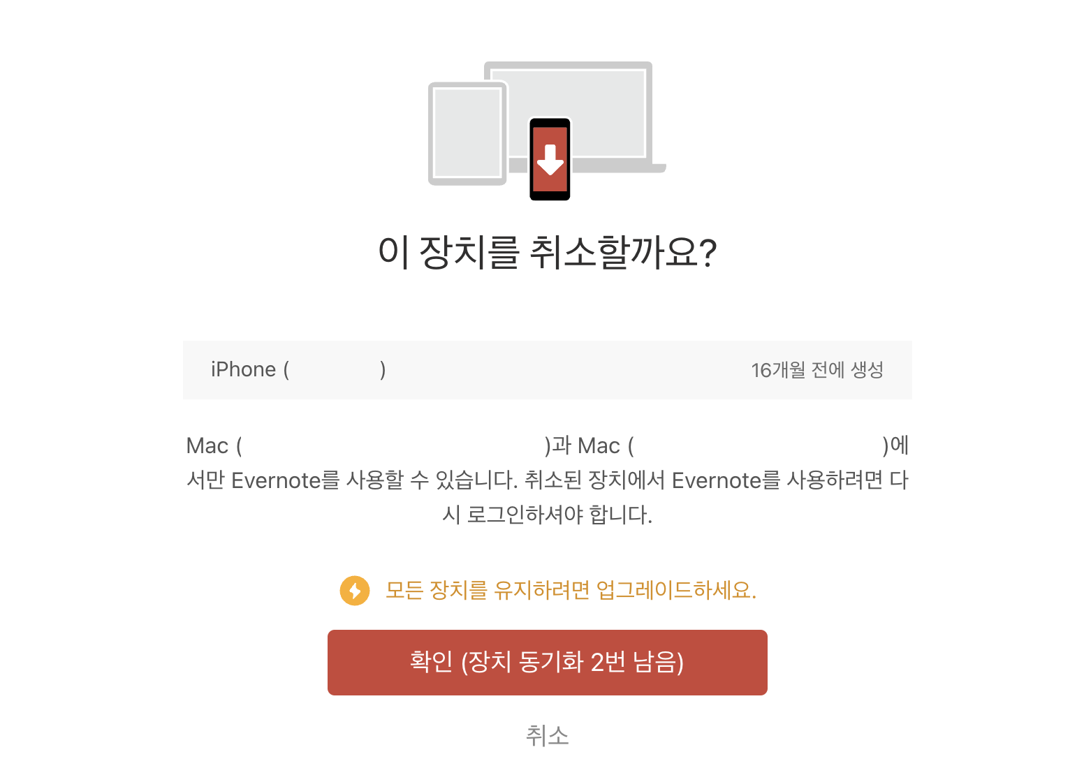 에버노트 2단계 인증이 끝난 뒤 [장치]에 느낌표가 있어서 들어갔더니 장치 수 제한에 도달했다고 한다.