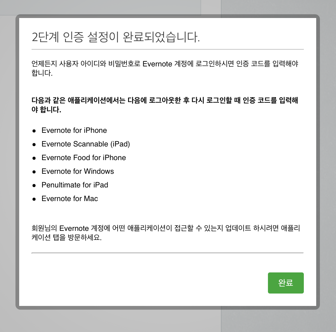 그리고 에버노트 '백업코드'를 4개 발급해 주는데
