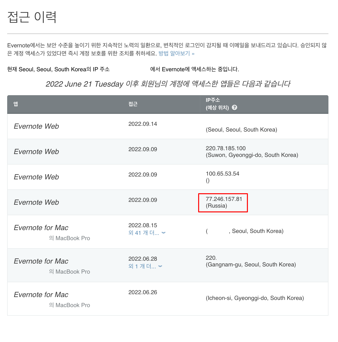 여긴 아까 위의 정보와는 다르게 9월 9일에 Evernote Web으로 해외에서 접근을 했다고 뜬다!