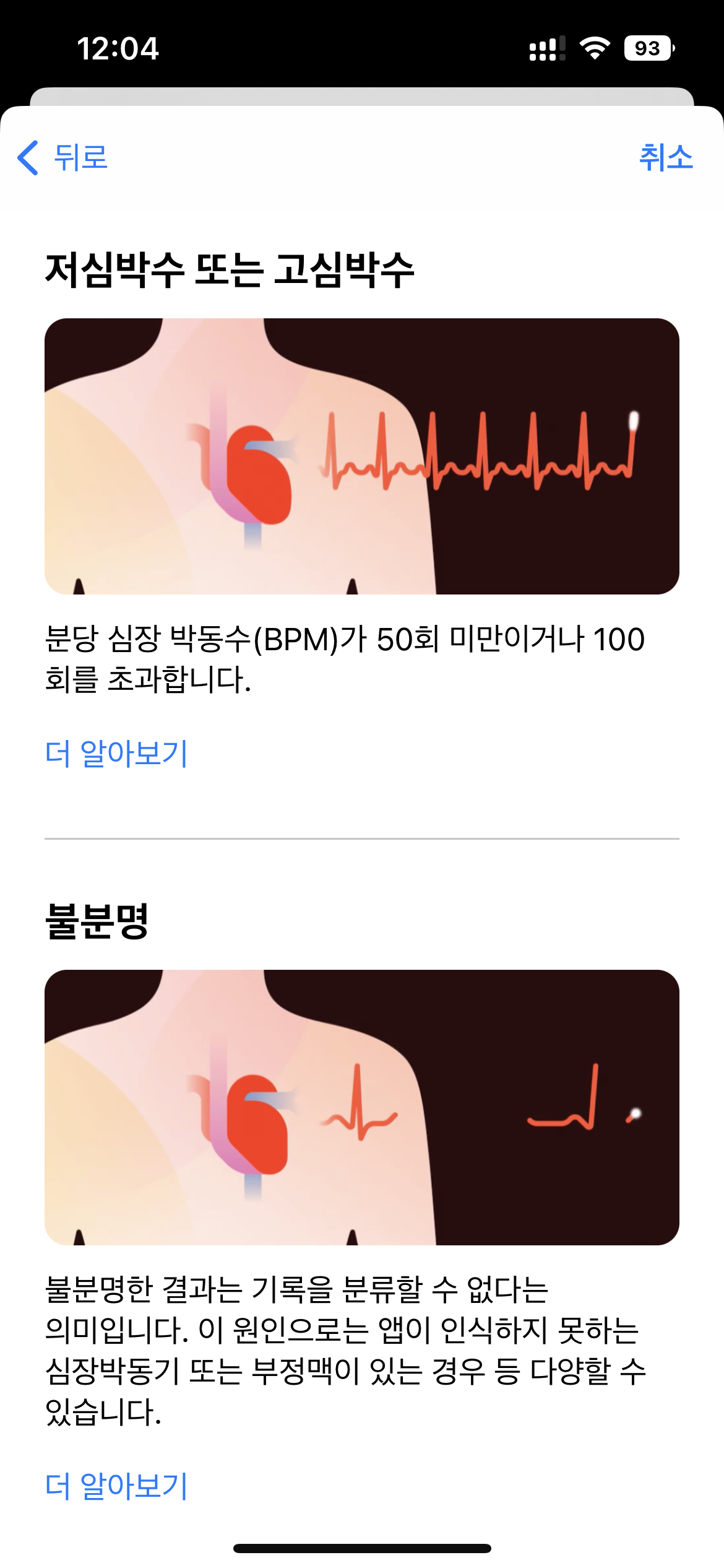 애플워치로 동리듬, 심방세동, 저심박수 또는 고심박수, 불분명 등을 측정한다고 한다.
