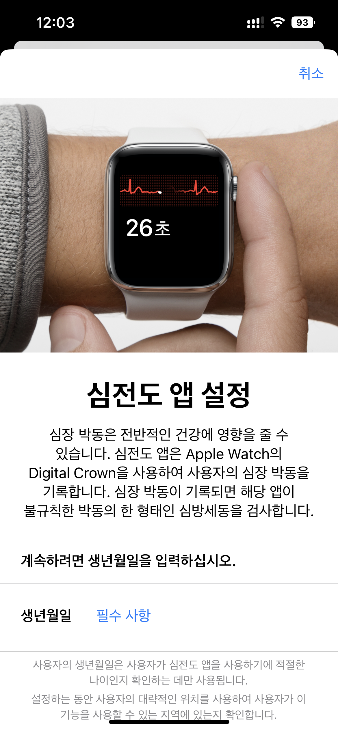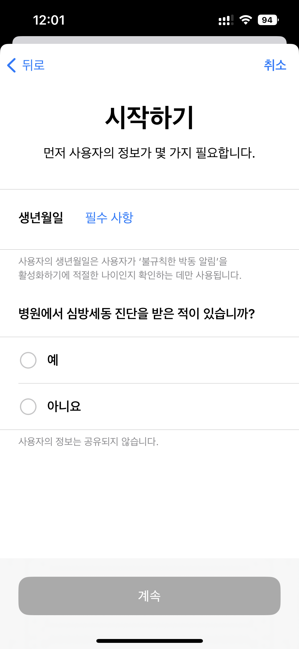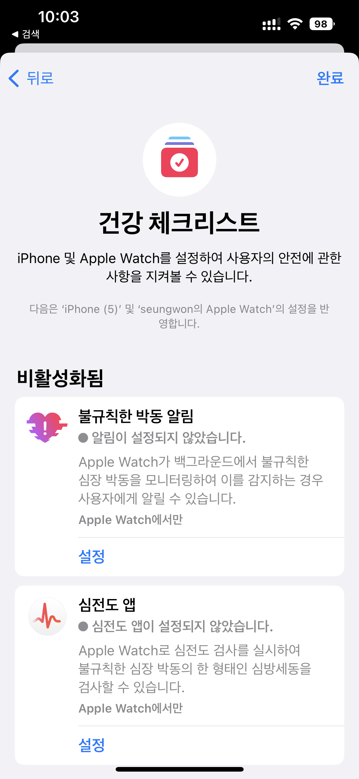 기본적으로 불규칙한 박동 알림, 심전도 앱이 비활성화 되어있었다.