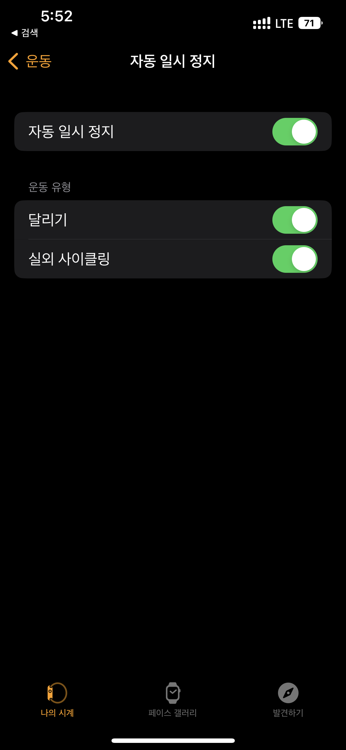 [자동 일시 정지]로 들어가서 달리기와 실외 사이클링을 켜두면 달리다가 움직임이 없어지면 자동으로 일시정지가 된다.