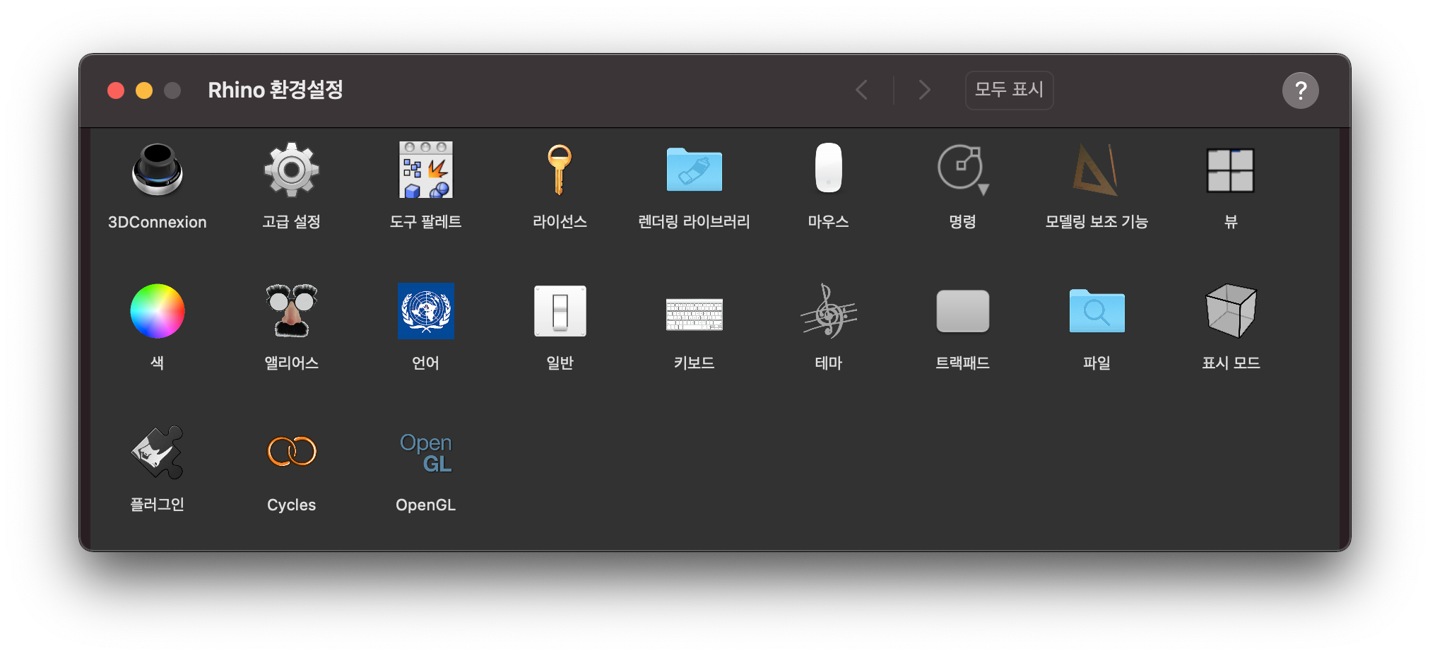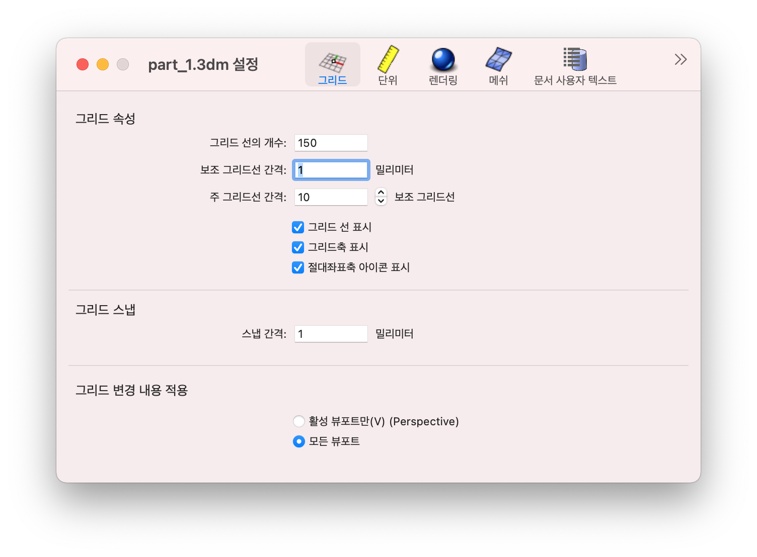라이노의 환경설정과는 다르게 '그리드'설정은 다른곳에서 해야 한다.