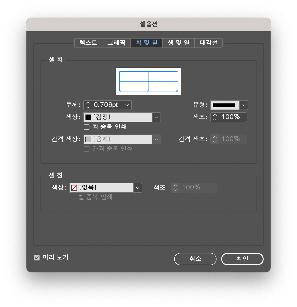 내부의 획은 셀 옵션에서 조정을 해준다고 한다.