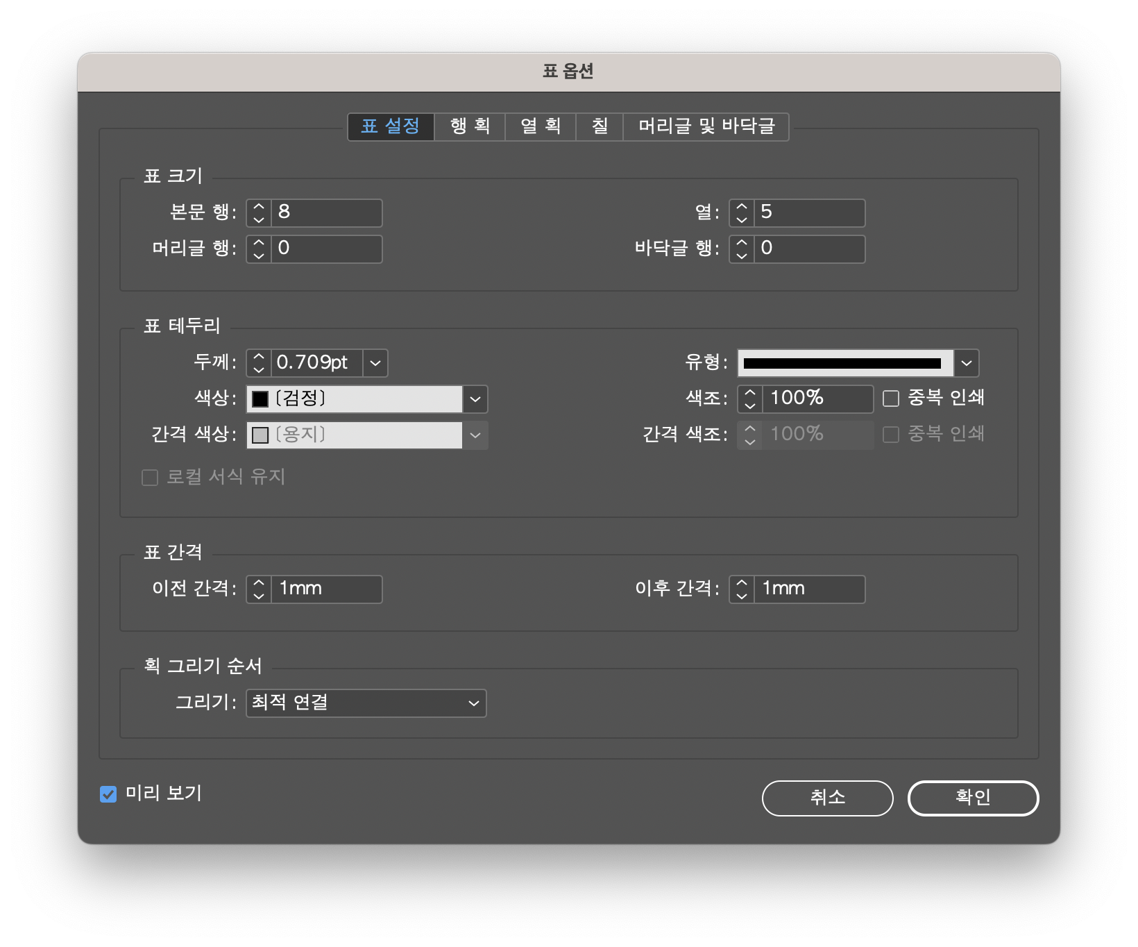 - cmd+opt+shift+B: 표 옵션에서도 행열을 변경할 수 있다.