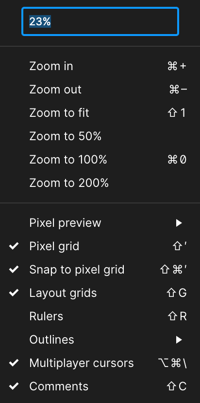 - 픽셀 그리드(Pixel grid): 줌을 확대했을 때 1px 단위의 그리드 선이 보이는 옵션을 끄고 켤 수 있습니다.