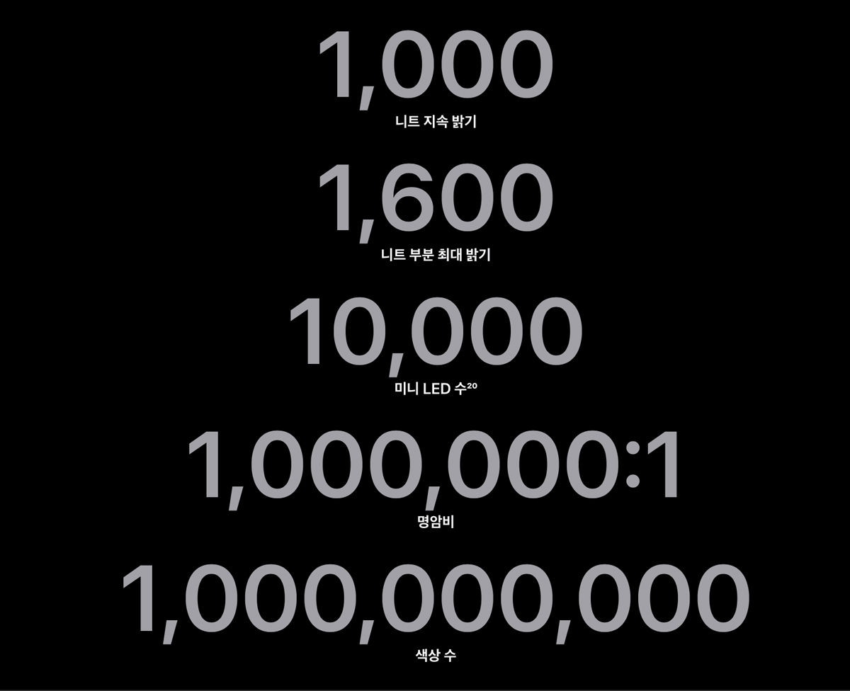 XDR이란 명칭이 들어간 디스플레이만 1,000니트 이상의 밝기를 표현할 수 있다.