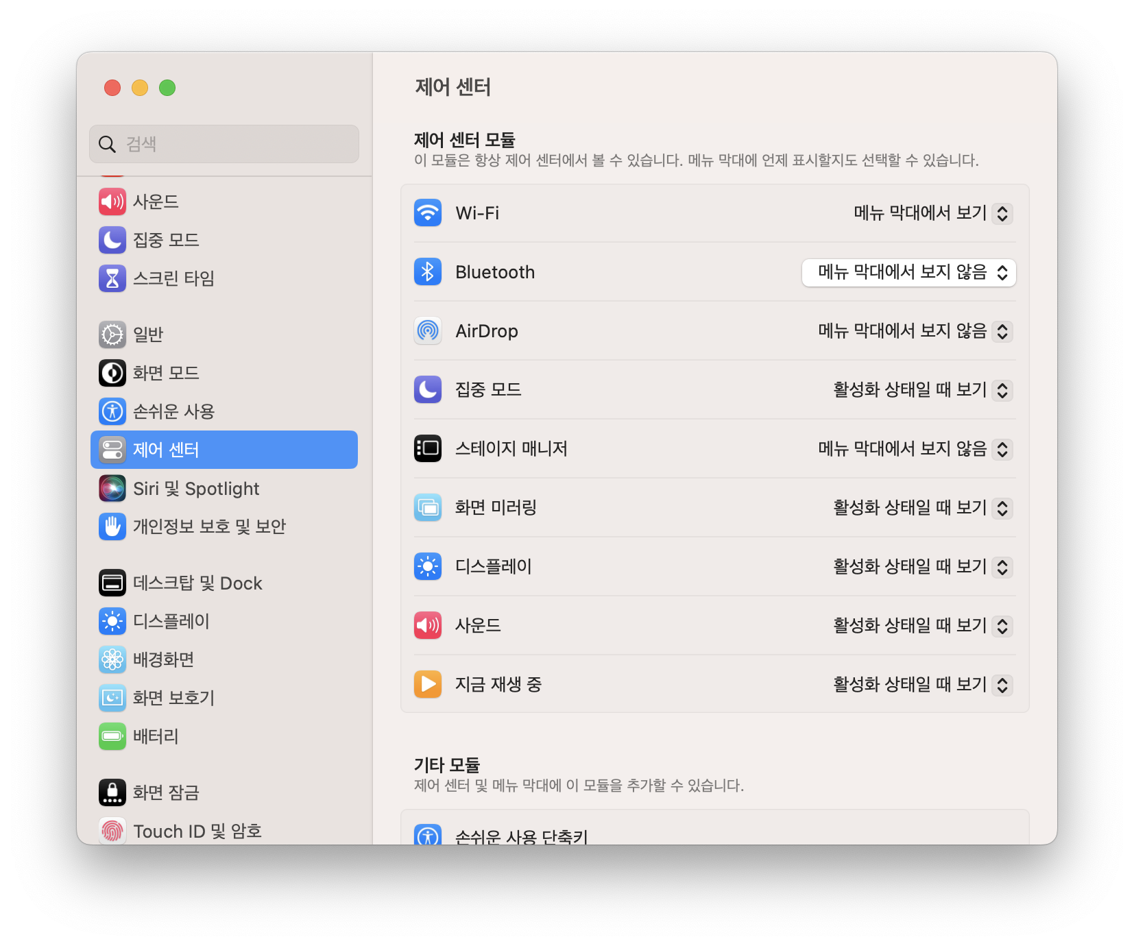 우측에 제어센터에 표시할 수 있는 아이콘 목록들이 나열되어있다.