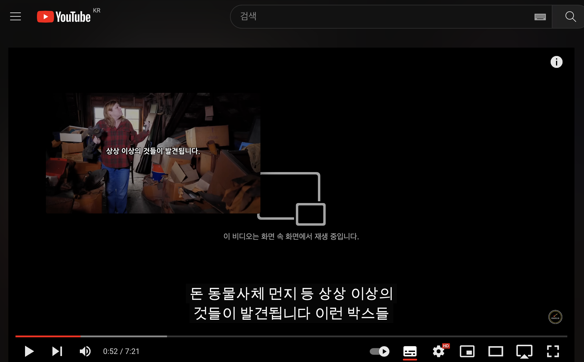 '화면 속 화면 시작'을 클릭하면 유튜브 화면이 작은 화면으로 빠져나와 어느 위치든 옮겨두고 화면을 볼 수 있다.