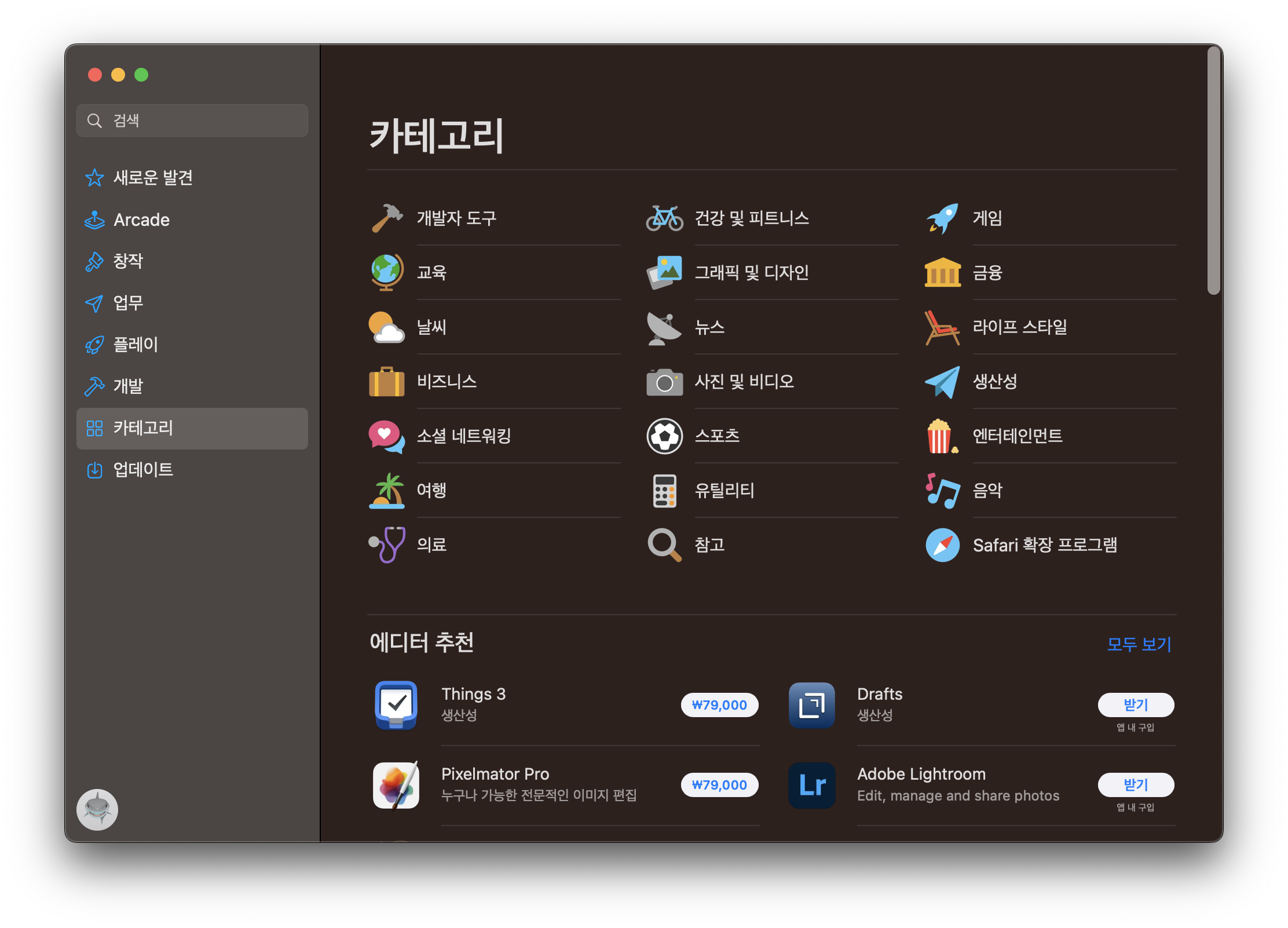 사파리의 경우 앱스토어 앱을 실행 후 왼쪽의 '카테고리'를 선택 후 우측의 'Safari 확장 프로그램'을 선택한다.