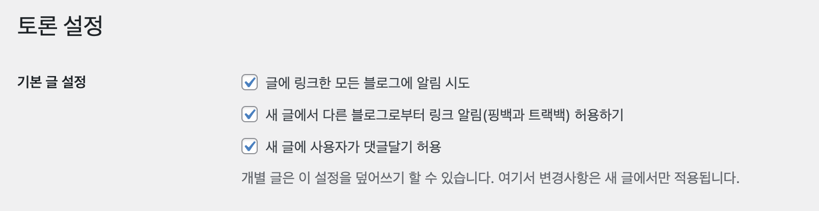 [설정]-[토론] 에서 댓글에 관한 모든 셋팅을 할 수 있다.