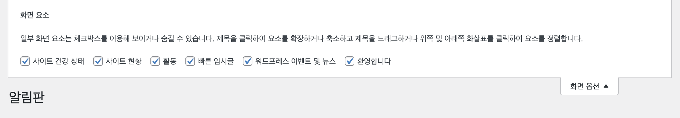워드프레스 관리자 메뉴 우측 상단에는 '화면 옵션'이 있다.