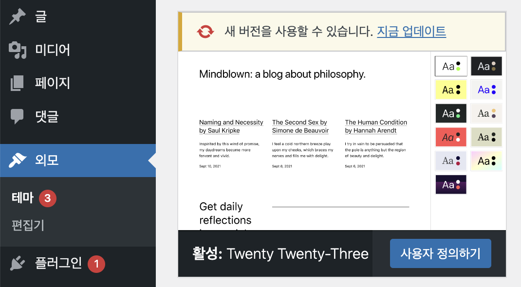 오른쪽 테마 목록에서 '사용자 정의하기'를 클릭해서 디자인을 변경할 수도 있다.