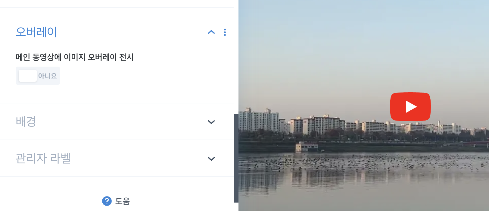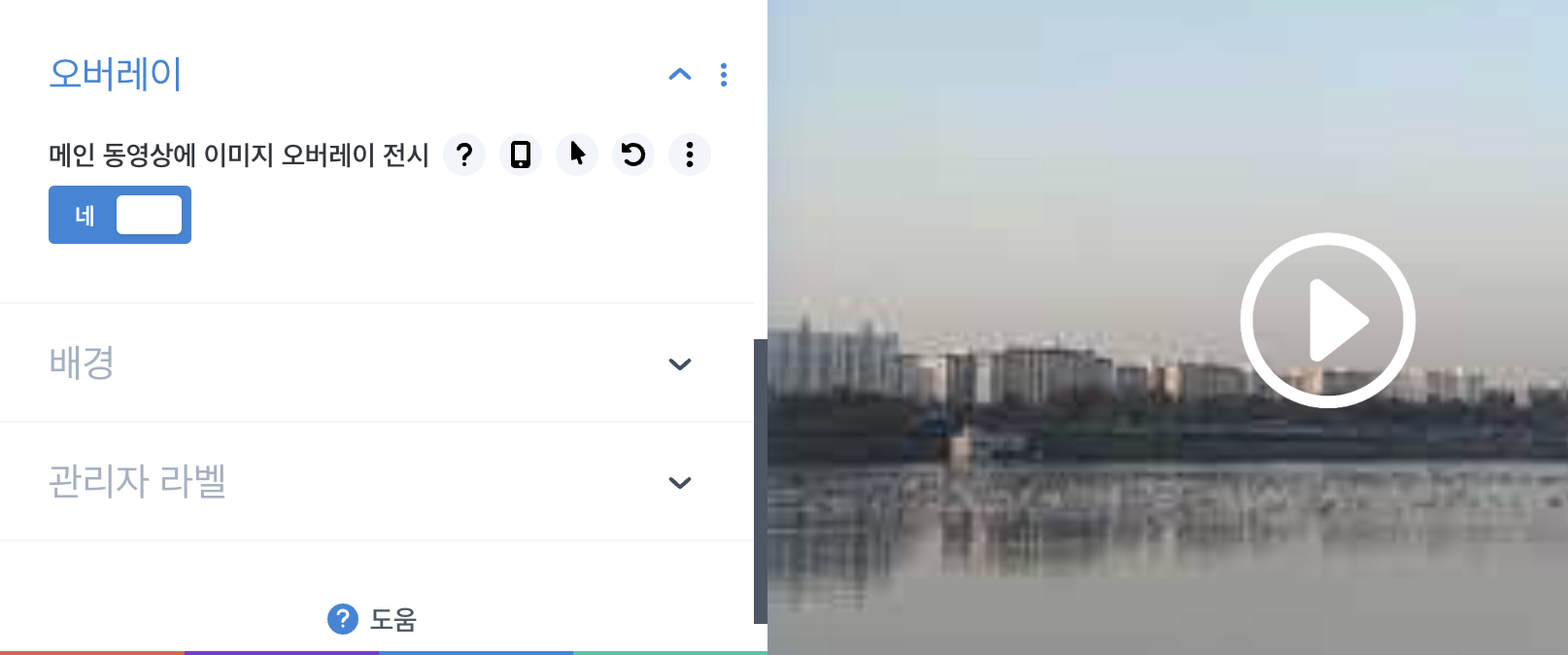 '오버레이'에 들어가면 영상 플레이어 아이콘의 컬러나 형태를 바꿔 줄 수 있다.