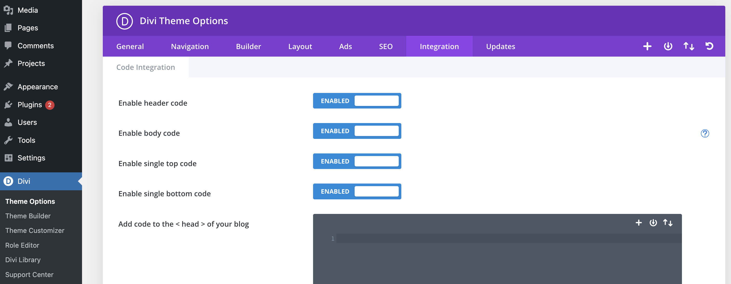 divi-Theme options-Intergration 으로 들어가면