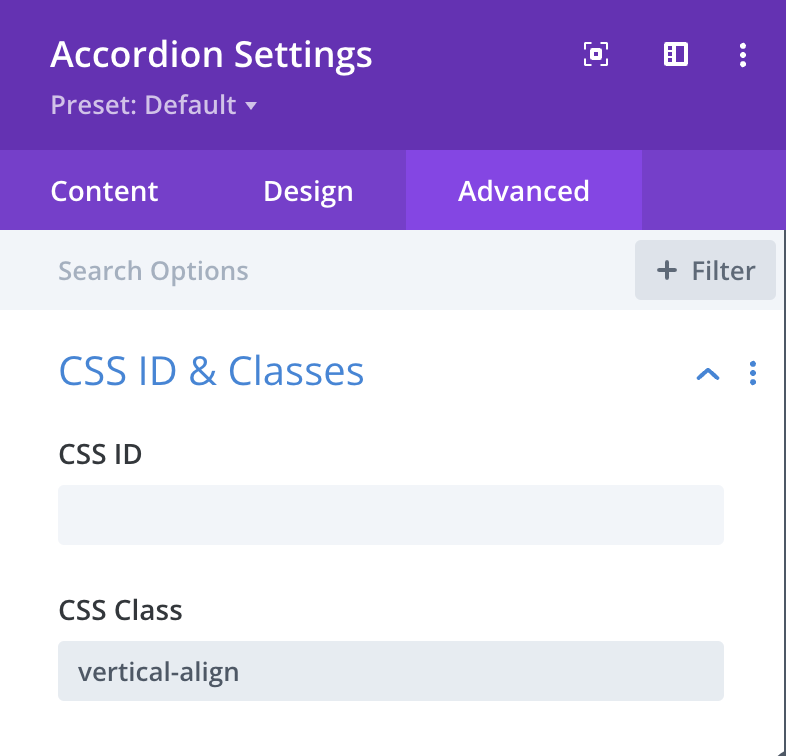 아코디언 모듈 선택후 'advanced' 메뉴에서 CSS Class 이름을 vertical-align 이라고 지정해줬다.