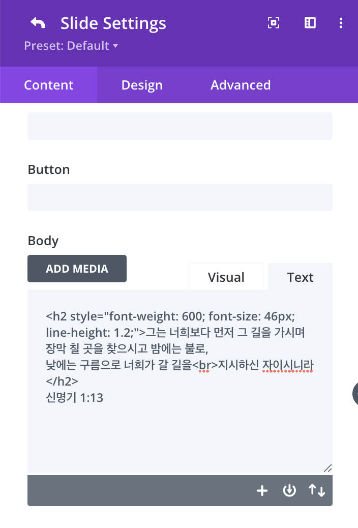 본문 텍스트 입력하는 곳에 텍스트를 입력해야 여러가지 태그 속성을 적용할 수 있다.