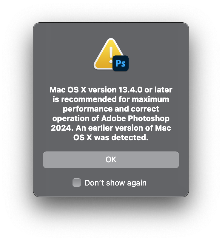 Mac OS X version 13.4.0 or later is recommended for maximum performance and correct operation of Adobe Photoshop 2024.