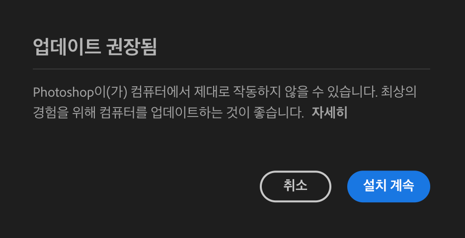 Photoshop이(가) 컴퓨터에서 제대로 작동하지 않을 수 있습니다.
